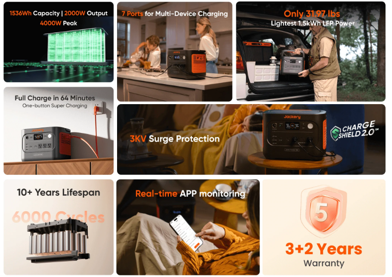 The Jackery Solar Generator 1500 v2 combines the Explorer 1500 v2 with SolarSaga 100W Air solar panels to provide clean, quiet, and sustainable energy anywhere. Perfect for camping, RV trips, or emergencies, it keeps your devices running with free solar power — no fuel, no noise.