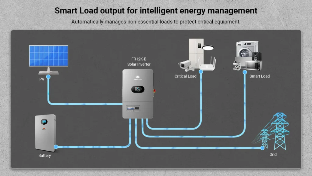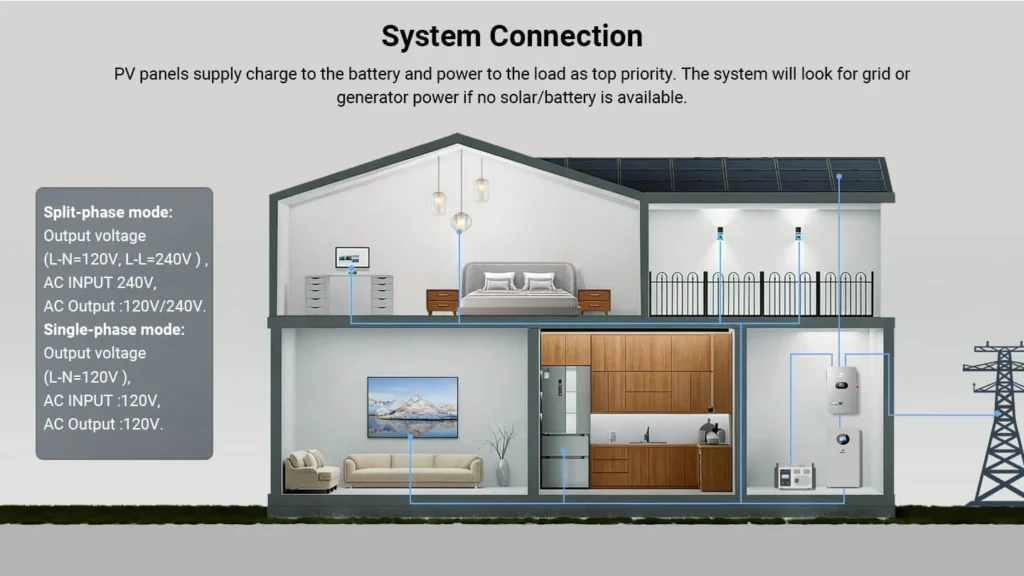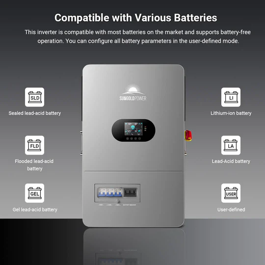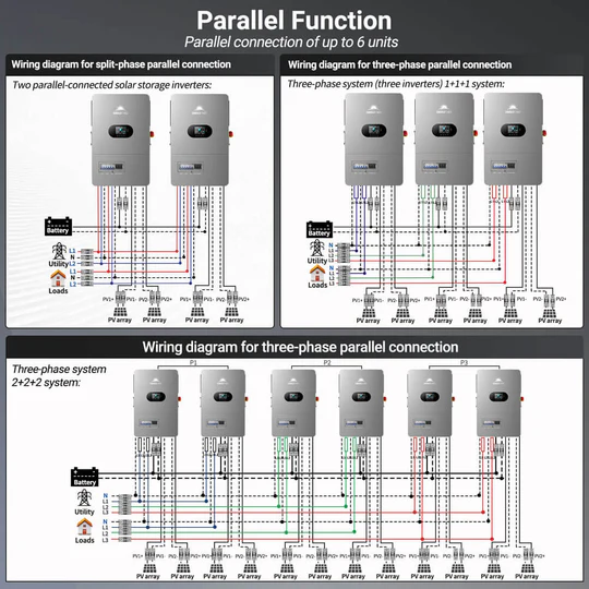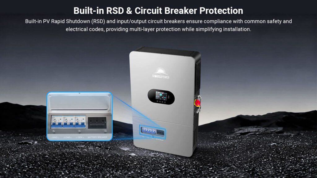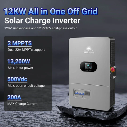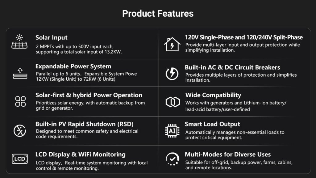 This high-performance all-in-one off-grid inverter delivers 12kW of continuous output (24kW peak), supporting 120V single-phase and 120V/240V split-phase input—perfect for homes and small businesses. Up to 6 units can be connected in parallel for a total output of 72kW. Dual 22A MPPTs support up to 13.2kW of solar input, enabling both PV-only and hybrid charging modes. The inverter includes an independent generator port that can double as a second load output, making it easy to manage critical and non-critical loads. Built-in PV Rapid Shutdown (RSD) protection ensures safe and reliable off-grid operation.