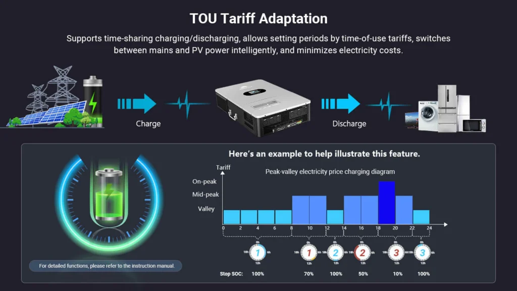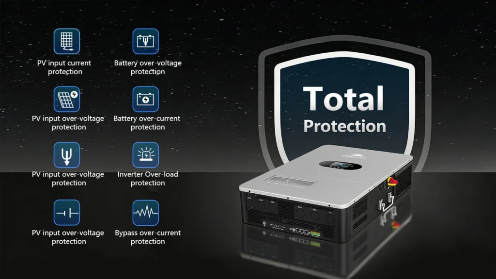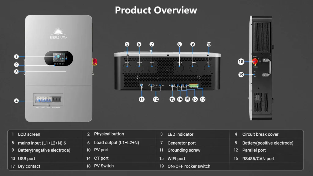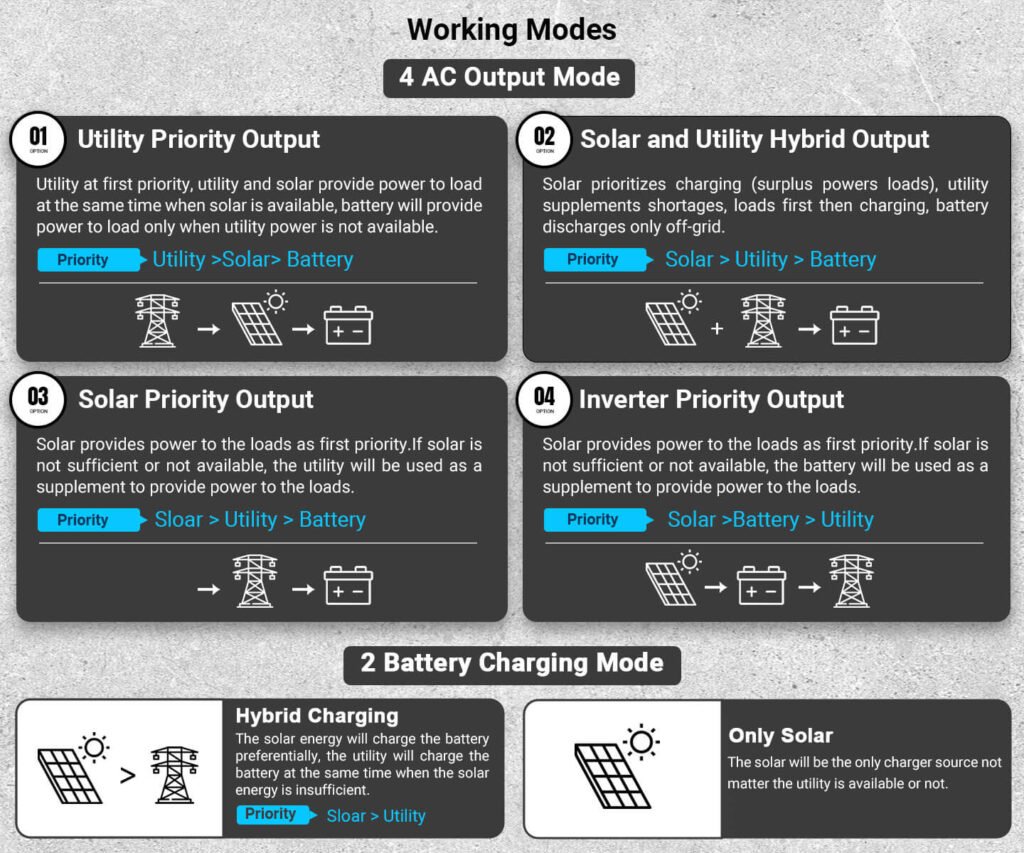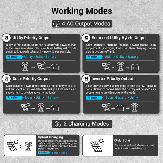 This high-performance all-in-one off-grid inverter delivers 12kW of continuous output (24kW peak), supporting 120V single-phase and 120V/240V split-phase input—perfect for homes and small businesses. Up to 6 units can be connected in parallel for a total output of 72kW. Dual 22A MPPTs support up to 13.2kW of solar input, enabling both PV-only and hybrid charging modes. The inverter includes an independent generator port that can double as a second load output, making it easy to manage critical and non-critical loads. Built-in PV Rapid Shutdown (RSD) protection ensures safe and reliable off-grid operation.