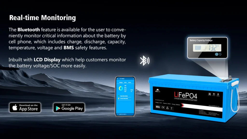 The 12V 100Ah/ 200Ah LifePO4 Battery with advanced BMS and self-heating function ensure a 4000 long cycle life and exceptional discharge performance. If you’re searching for a deep cycle battery for caravan, RV, solar system, or marine use, this lightweight, auto-balanced, bluethooth, IP65 grade and long-cycle-life 100Ah/ 200Ah lithium battery is the perfect solution for you. The 12V 200Ah lithium ion battery delivers reliable power in all conditions, ensuring peace of mind during your outdoor adventures or off-grid activities.