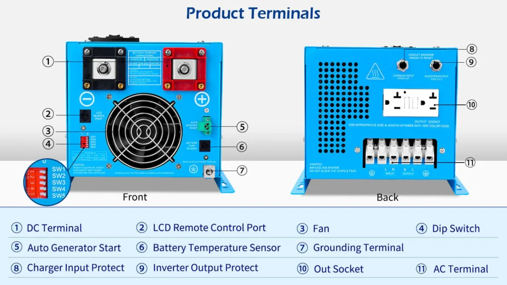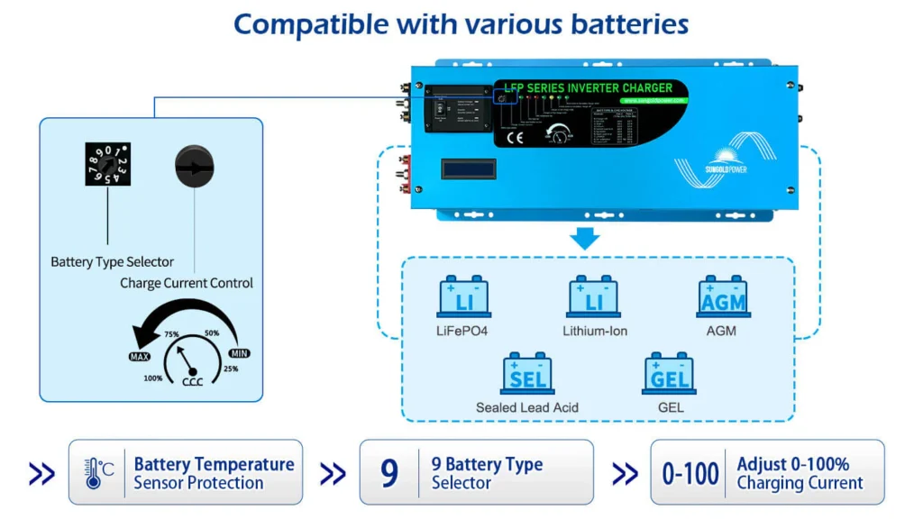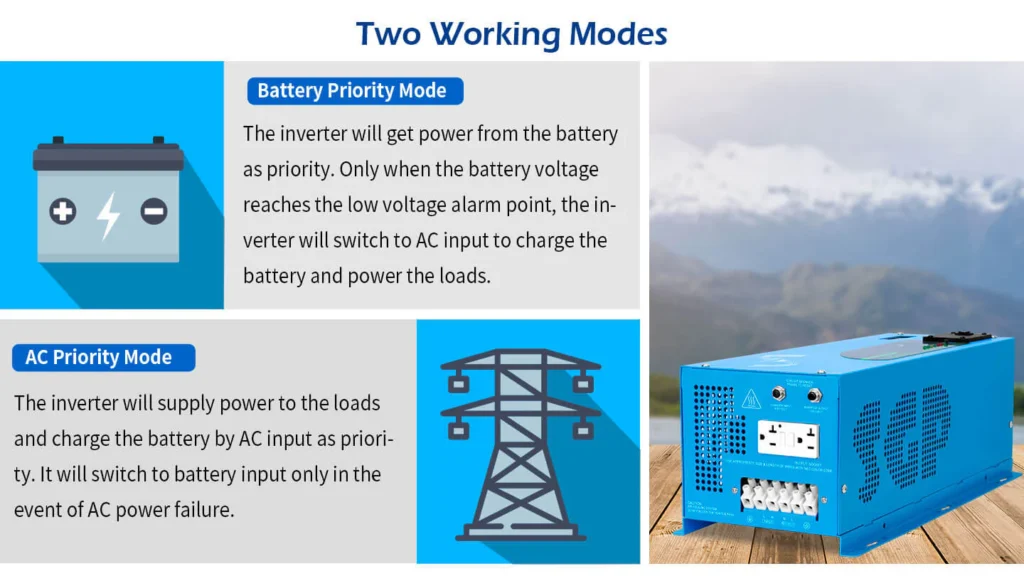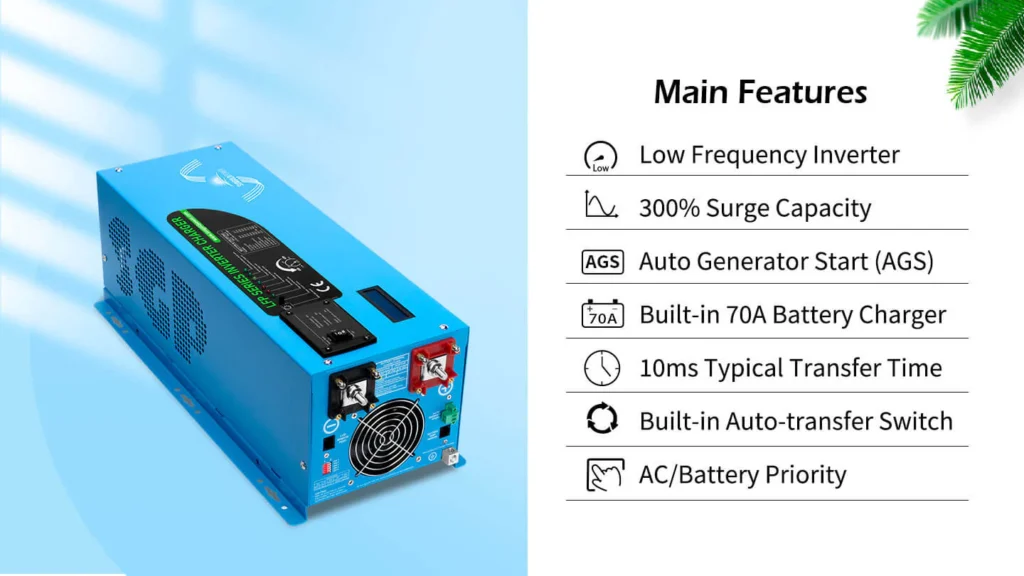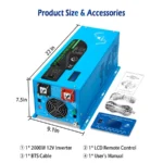 If you are looking for a pure sine-wave inverter/charger, the 2000W SunGoldPower low-frequency pure sine-wave inverter is an excellent choice. It combines inverter, battery charger and transfer switch functionality into one complete system, This 12V DC to 120V AC inverter boasts a 300% surge capacity for 20 seconds to reliably support tools and equipment longer.