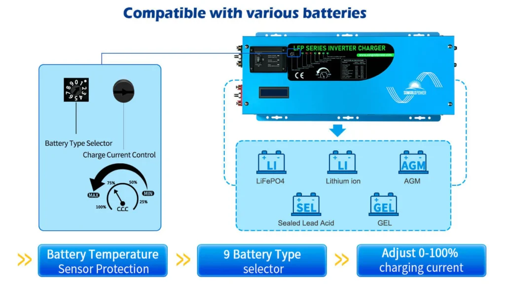If you are looking for a pure sine-wave inverter/charger, the 3000W SunGoldPower low-frequency pure sine-wave inverter is an excellent choice. It combines inverter, battery charger and transfer switch functionality into one complete system, This 12V DC to 120V AC inverter boasts a 300% surge capacity for 20 seconds to reliably support tools and equipment longer.