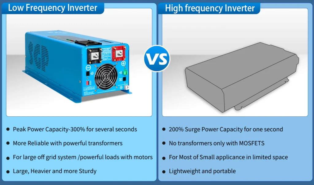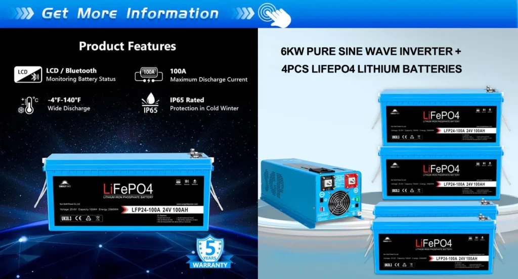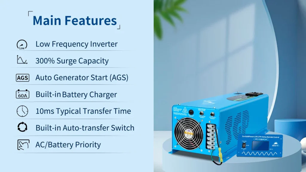 The SunGoldPower LFP 6000 Watt DC 48V AC 120/240 Split-Phase Inverter Charger is a top-quality low-frequency power inverter, built for running a small home, business, RV, trailer or boat application to support off-grid system functionality and/or enable emergency backup power.