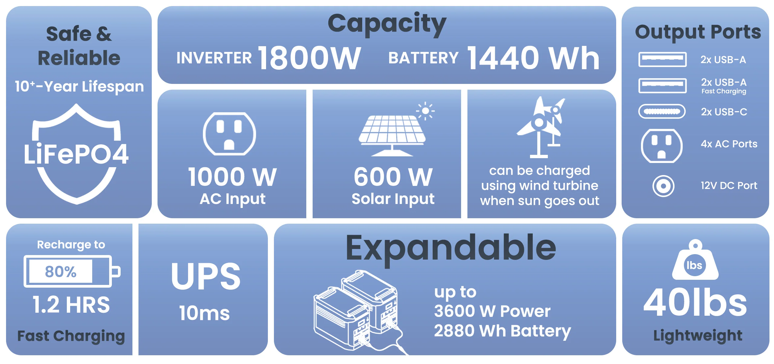 Reliable 1800W performance with expandable capacity, multi-charging options, and dependable backup power for home, emergency, and outdoor use.