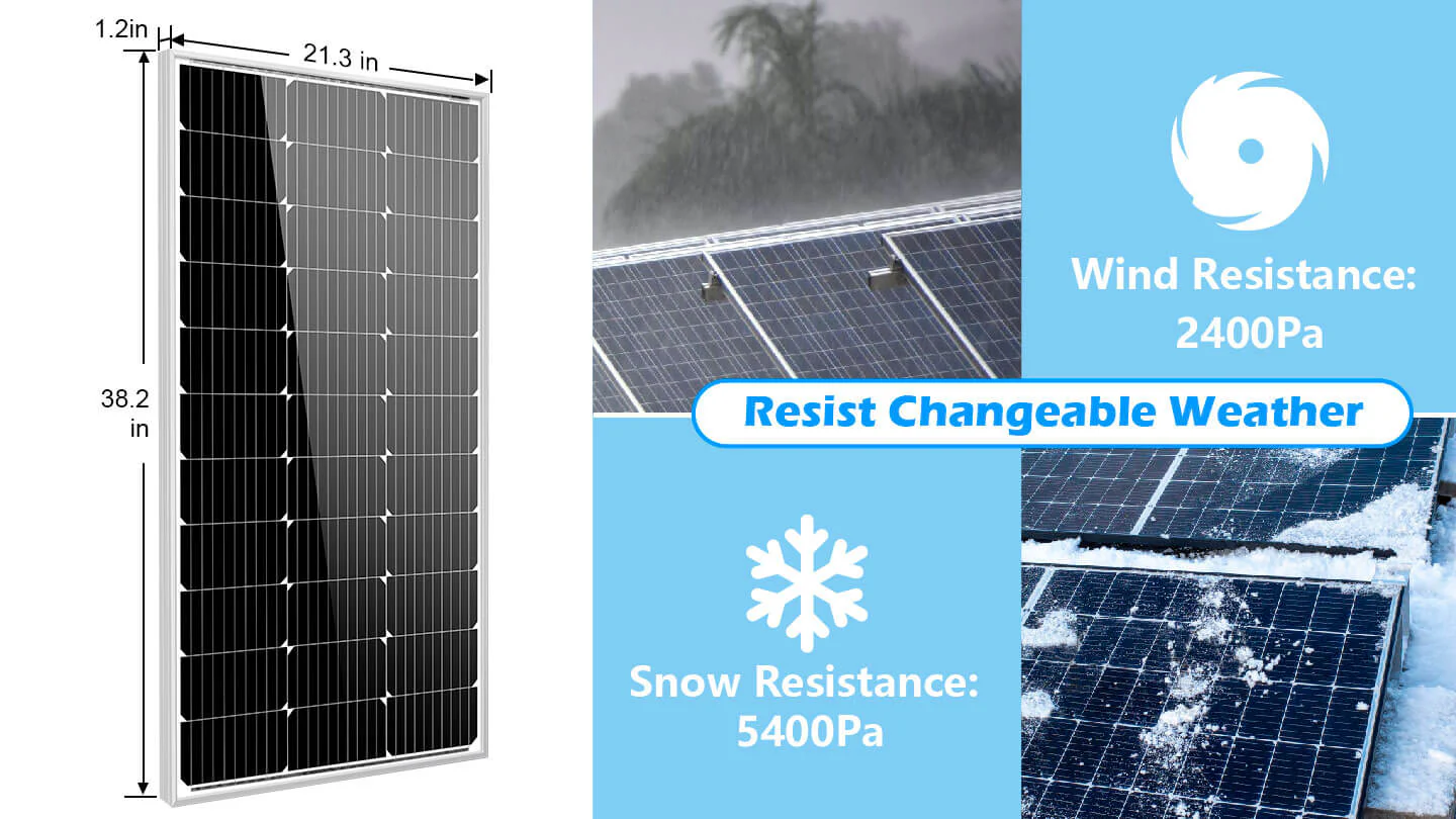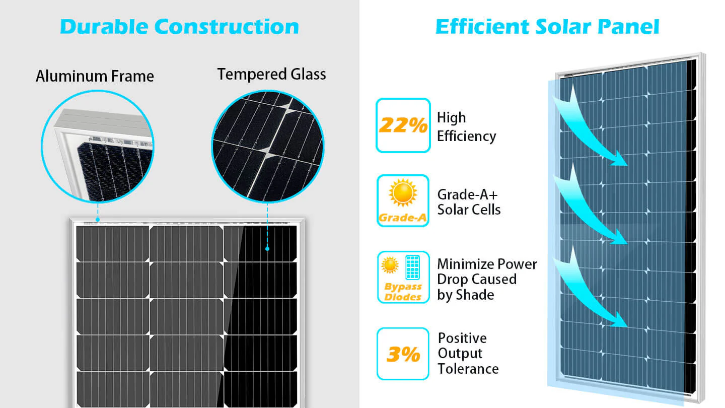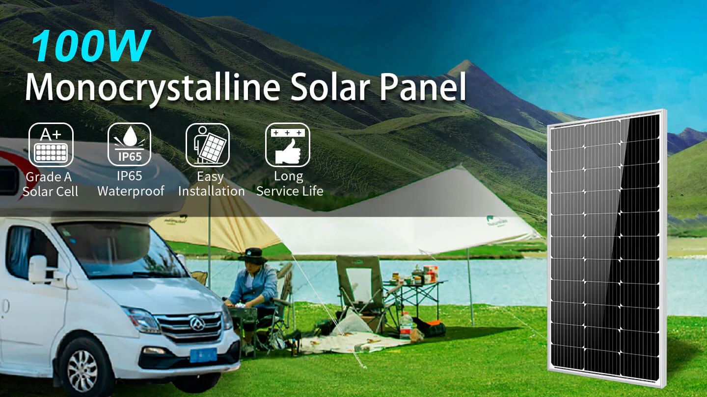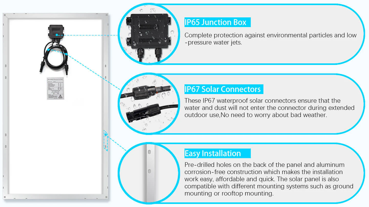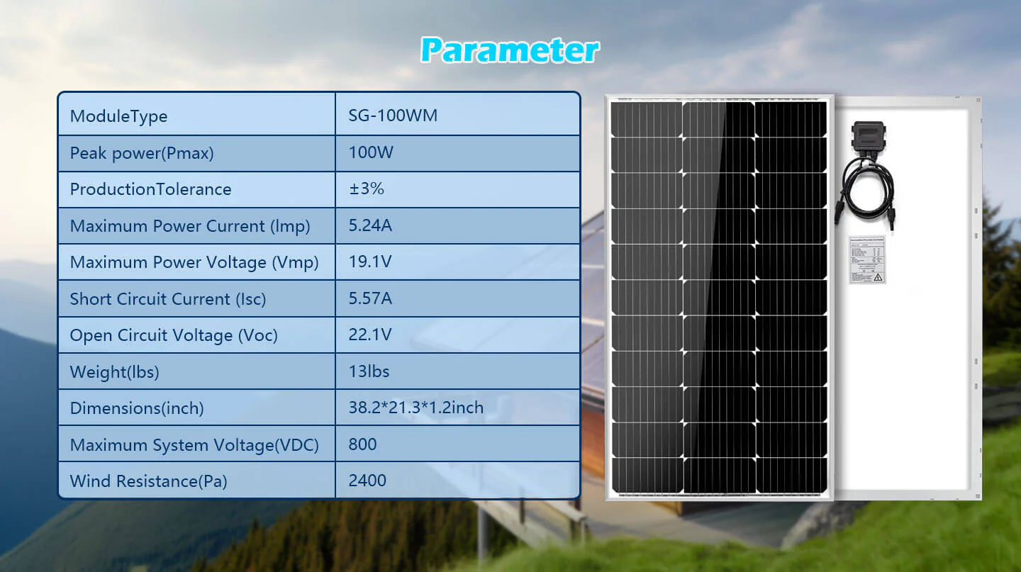 The SunGoldPower 100W solar panel provides quiet, clean energy which makes it easy to get the electrical power you need from the sun to supply a cabin, camper, RV, or boat. Each 100W solar panel features highly-efficient silicon solar cells. It also comes with an IP65-rated junction box, making it suitable for marine applications. The aluminum frame (corrosion-resistant) is ideal for extended outdoor use, enhancing the overall lifespan of a solar panel.