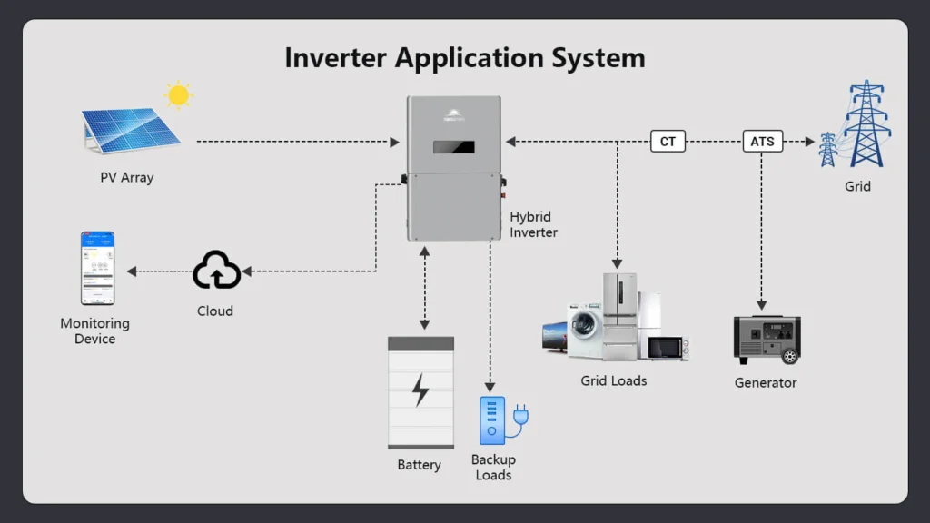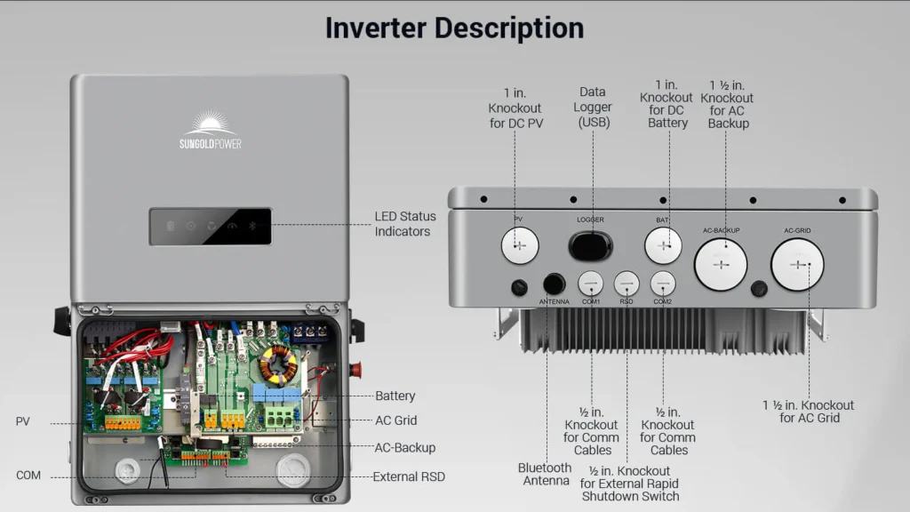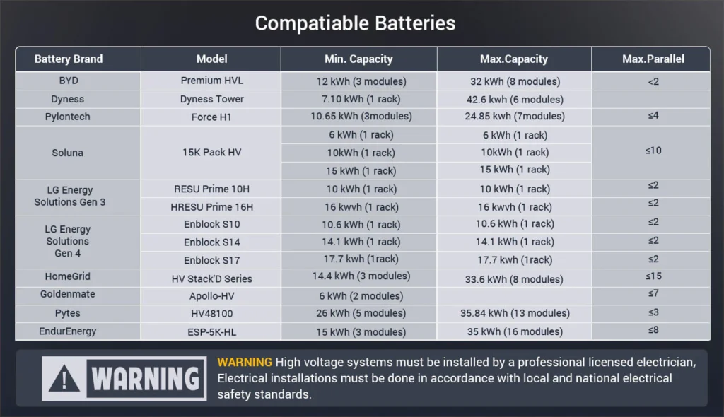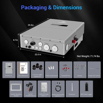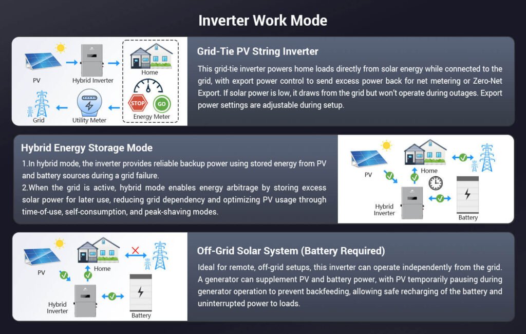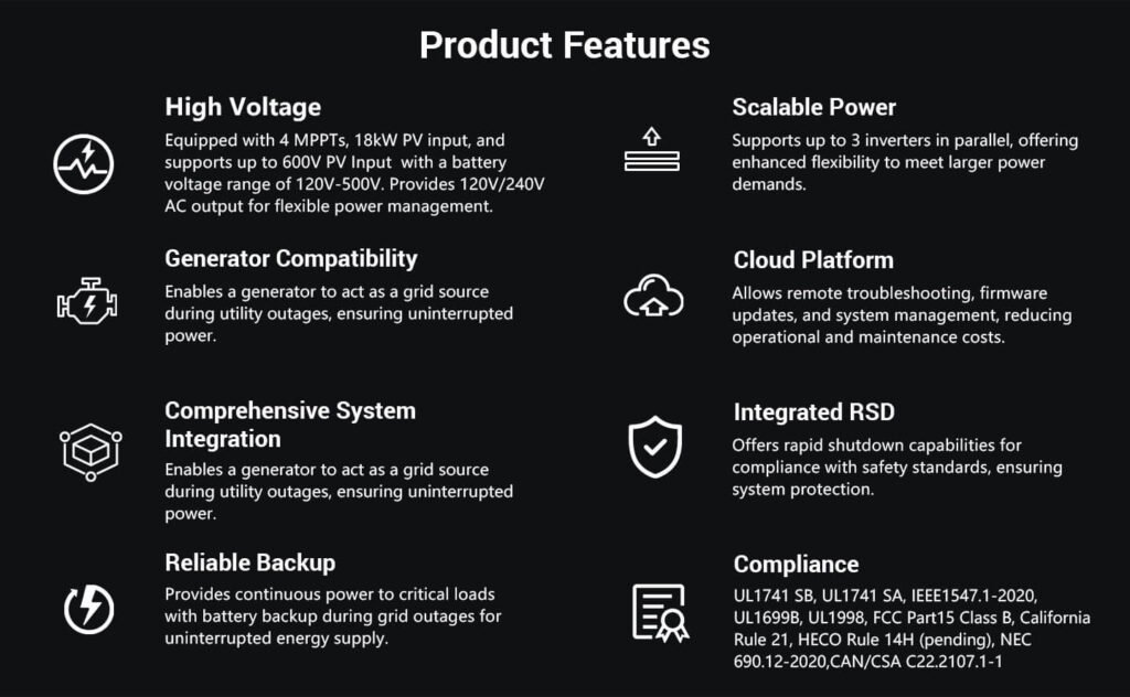 This inverter delivers 11.4kW continuous output at 120V/240VAC while supporting a maximum PV input of 18.24kW. It is designed to work with high voltage lithium-ion batteries (120V-500V), optimizing self-consumption and providing reliable backup power in case of grid failure or when PV power is insufficient. It operates efficiently in both on-grid and off-grid applications and can be AC coupled and DC-coupled with various batteries, providing a versatile and flexible solution for different energy needs.