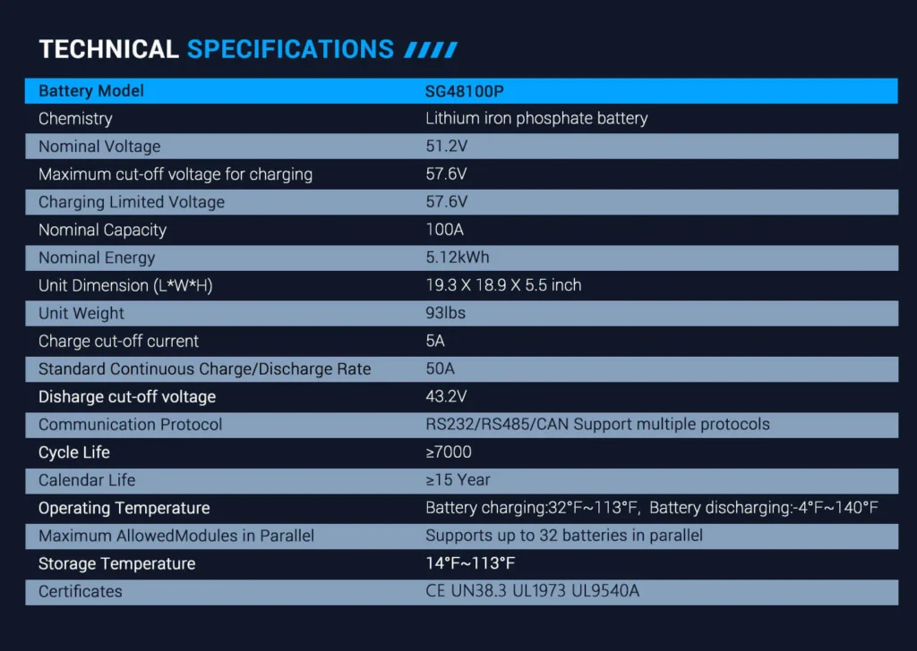 The SG48100P Lithium Battery is built for energy storage and provides well-designed and high-performance standard battery pack. The battery is compact, easy to install, free of maintenance and can be installed in parallel in the energy storage system to increase its capacity. lt is widely used in home applications, small commercial and industrial energy storage, and others.