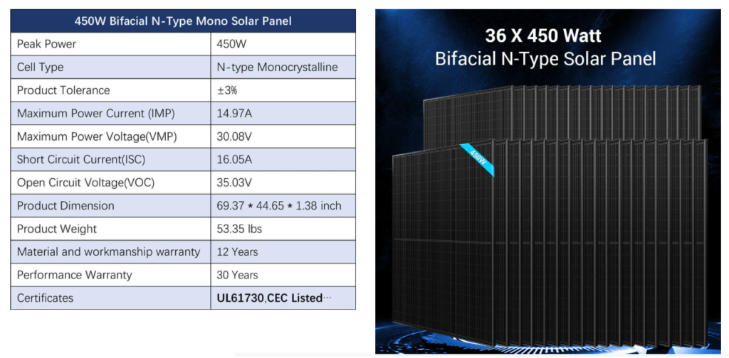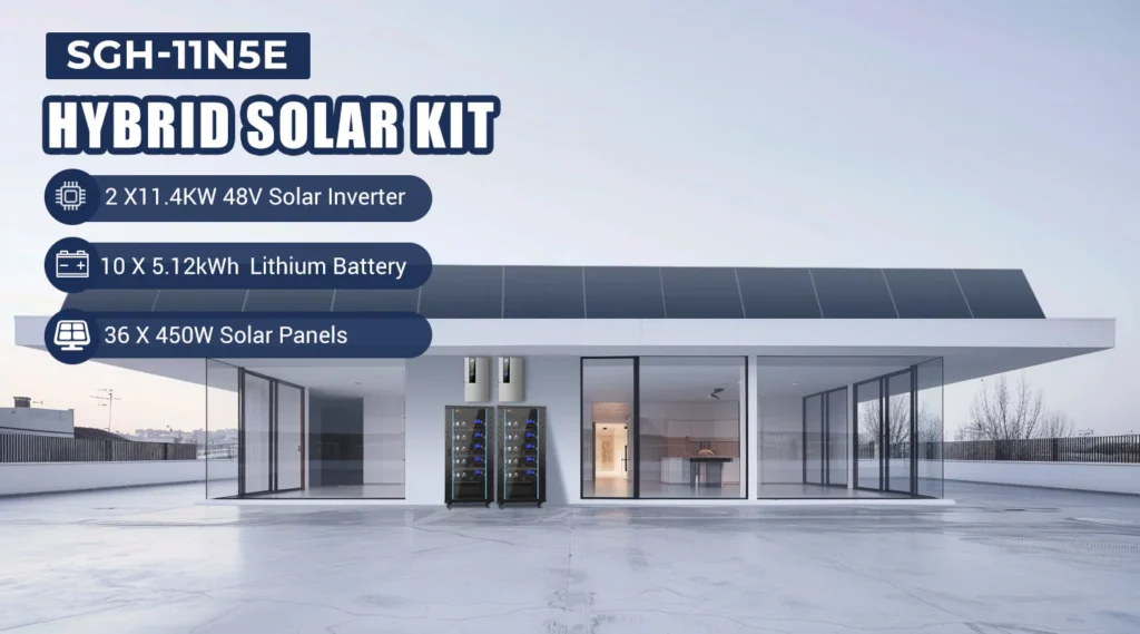This Solar Kit includes 16.2kW of solar panels, (2) 11.4kW hybrid inverters, and 51.2KWh of lithium battery storage. The system supports flexible configurations—off-grid, hybrid, or grid-tied—enabling you to power appliances with solar energy, feed excess power back to the grid, and optionally store energy to offset bills or provide backup during outages.