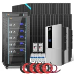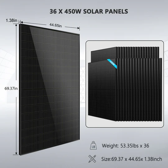 This Solar Kit includes 16.2kW of solar panels, (2) 11.4kW hybrid inverters, and 51.2KWh of lithium battery storage. The system supports flexible configurations—off-grid, hybrid, or grid-tied—enabling you to power appliances with solar energy, feed excess power back to the grid, and optionally store energy to offset bills or provide backup during outages.