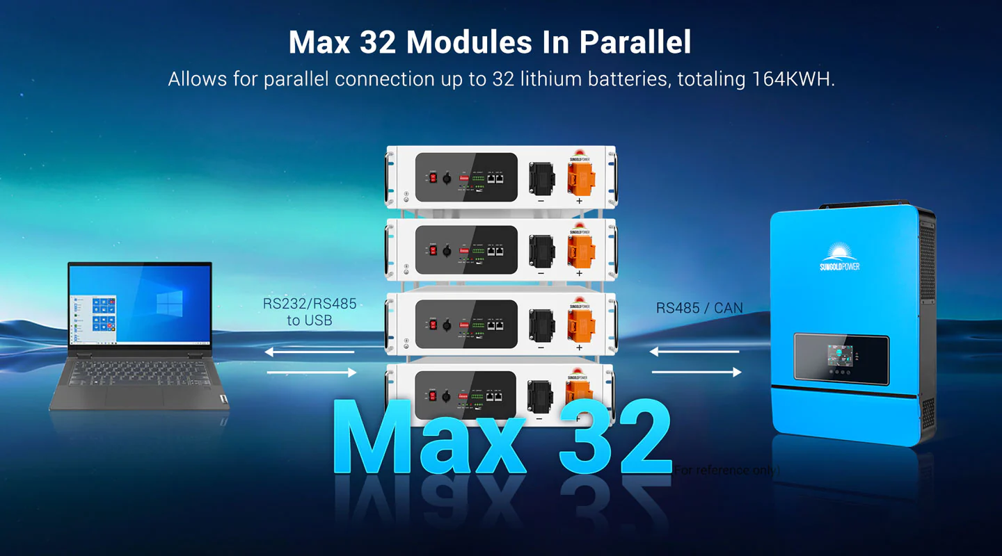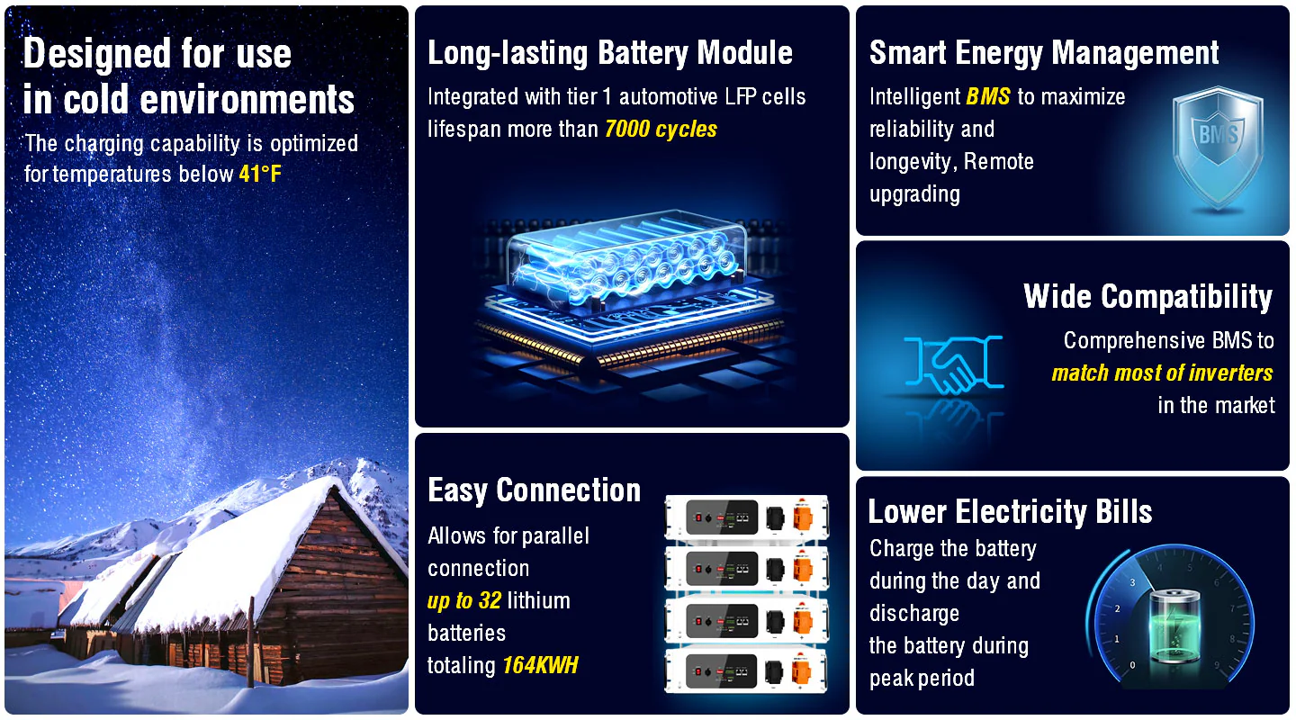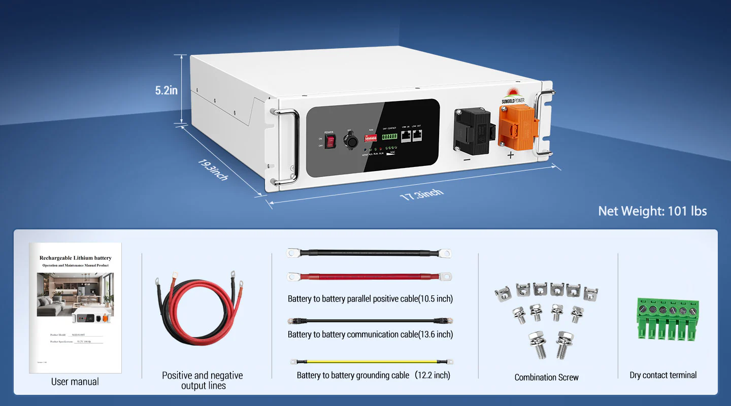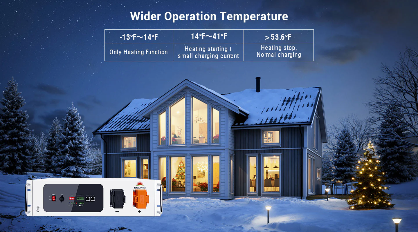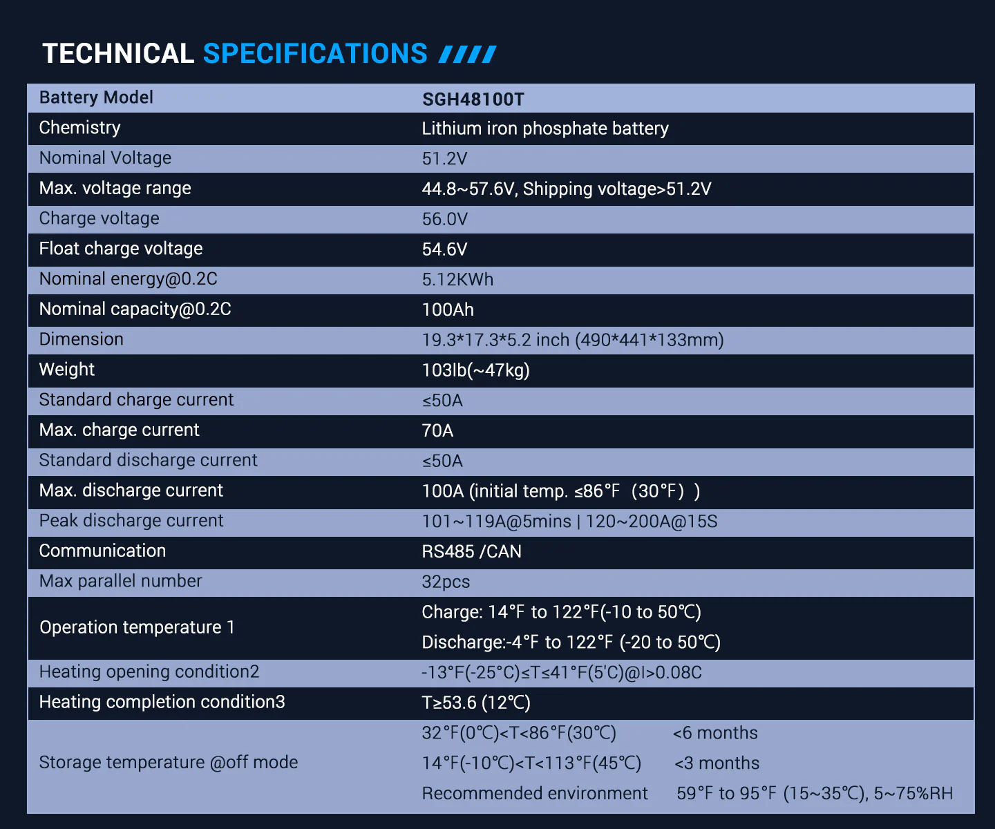 The SGH48100T 51.2V 100Ah offers nominal energy of 5.12kWh and integrates a self-heating system specially designed for energy storage applications in colder climates & storage areas. It activates the heating function automatically at temperature range of -13°F to 41°F and raises temperature to 53.6 °F rapidly to efficiently make the energy storage system ready to work.The 3U battery pack is compact, easy to install, maintenance-free, and can be assembled in parallel up to 32pcs when adding more capacity. This battery is widely used in home energy storage,small commercial and industrial system.