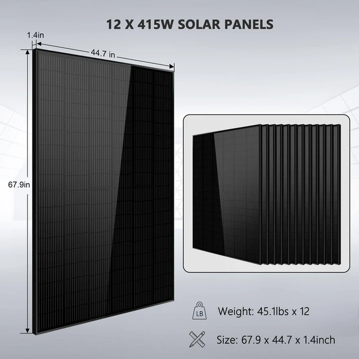 The SGM-10M2T solar kit is a great package which includes the (12) 415W solar panels, (4) 5.12kWh Powerwall battery, (2) 5kW solar inverters and (2) sets of solar cables and brackets. This system will produce around 20kWh per day based on 4 hours of sun. This size of system with a total of 10kW 120/240V split inverter capability is powerful enough to run everything from air conditioners and well pumps, fridge, TV, workshop, office and more! It is ready for expansion, up to 6 identical inverters can be paralleled in single-phase (120VAC) or split-phase (240VAC) or three-sphase (208V). You can add more batteries and solar panels according to your requirements. Let’s Enjoy off grid living and the adventure with Solar Energy Kit!