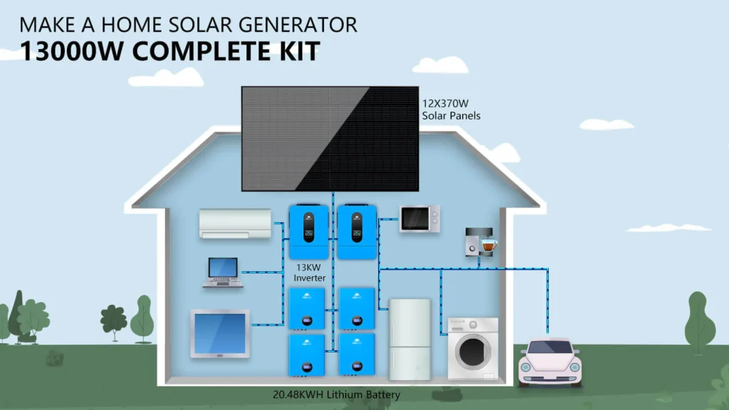 This off-grid solar power system kit provides nearly everything you need to bring off-grid solar power and battery storage to a home, cabin, or any other remote location. Kit includes (12) 370W solar panels, (4) 5.12 kWh PowerWall batteries, (2) 6.5kW solar inverters and (2) sets of solar cable and brackets. Kit will produce around 17.7kWh per day based on 4 hours of sun. The system is ready for expansion, up to 6 identical inverters can be paralleled in single-phase (120Vac) or split-phase (120/240Vac) or three-phase (208Vac) . You can add more batteries and solar panels according to your requirements. Enjoy off-grid living and the adventure with this Solar Energy Kit!