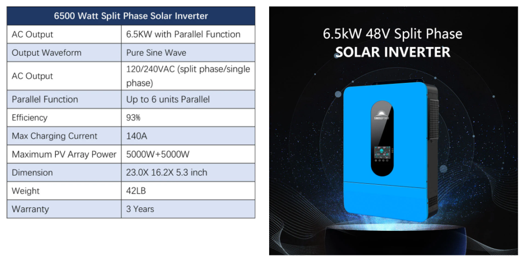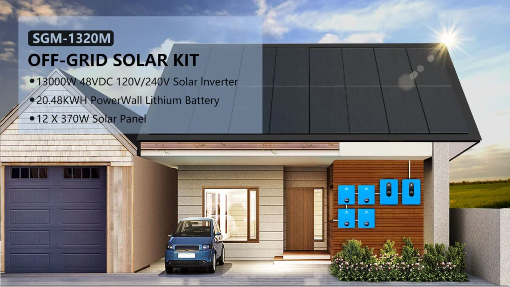 This off-grid solar power system kit provides nearly everything you need to bring off-grid solar power and battery storage to a home, cabin, or any other remote location. Kit includes (12) 370W solar panels, (4) 5.12 kWh PowerWall batteries, (2) 6.5kW solar inverters and (2) sets of solar cable and brackets. Kit will produce around 17.7kWh per day based on 4 hours of sun. The system is ready for expansion, up to 6 identical inverters can be paralleled in single-phase (120Vac) or split-phase (120/240Vac) or three-phase (208Vac) . You can add more batteries and solar panels according to your requirements. Enjoy off-grid living and the adventure with this Solar Energy Kit!