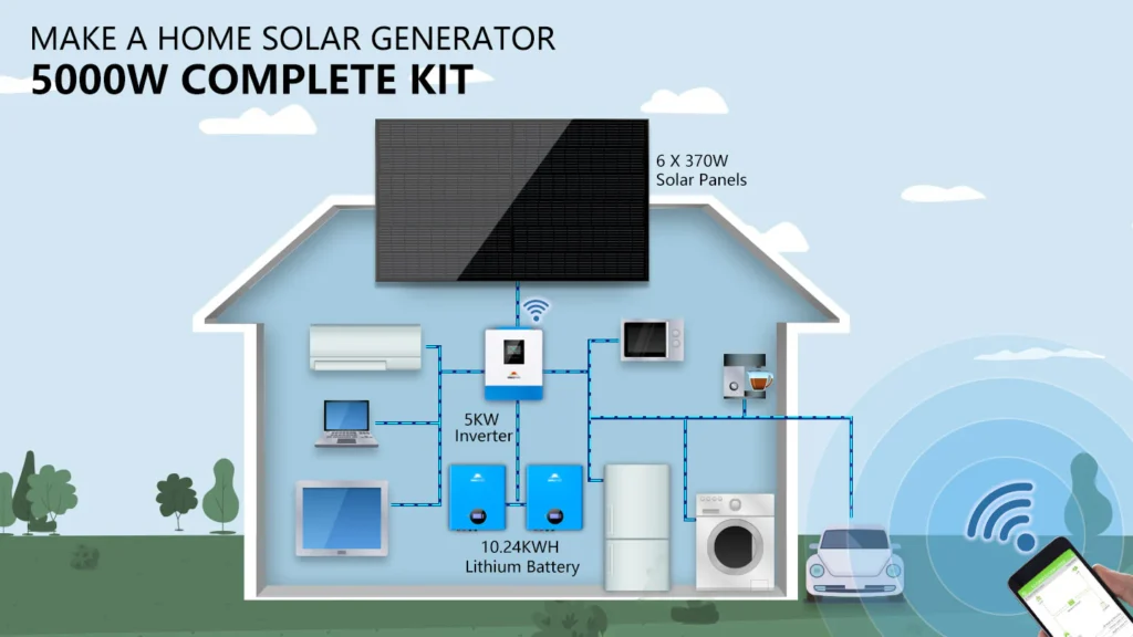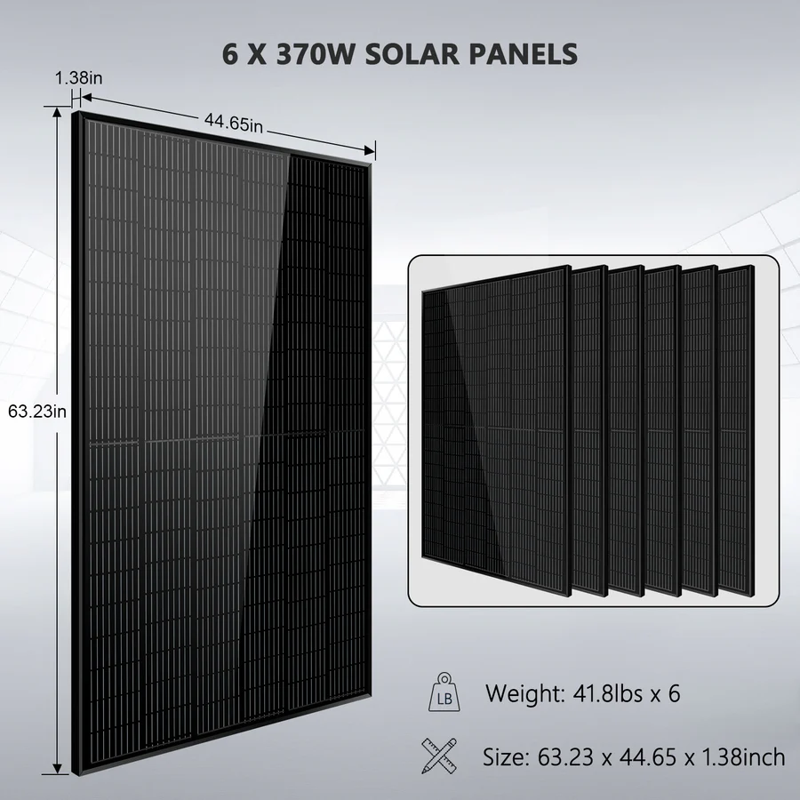 This off-grid solar power kit comes with nearly everything you need to bring solar power to mid-sized off-grid homes or remote cabins. This system includes a 5kW 48V 120Vac Pure Sine Wave Inverter which power most home appliances, (2) 51.2V 100Ah PowerWall Lithium batteries, and 2.22kW of solar panels. The system is ready for expansion, up to 6 identical inverters can be paralleled in single-phase (120Vac) or split-phase (240Vac) or three-phase (208Vac). You can also add more batteries and solar panels according to your requirements. The Wi-Fi monitor shows the performance and energy data of your solar system through an app. Enjoy off-grid living and the adventure with this Solar Energy Kit!