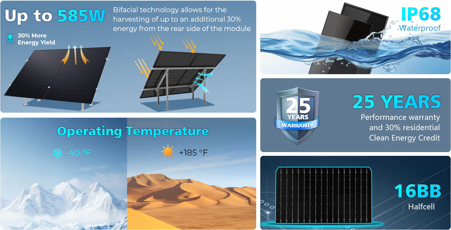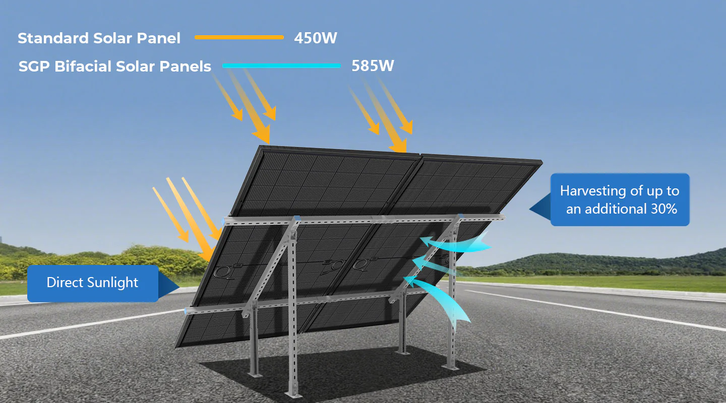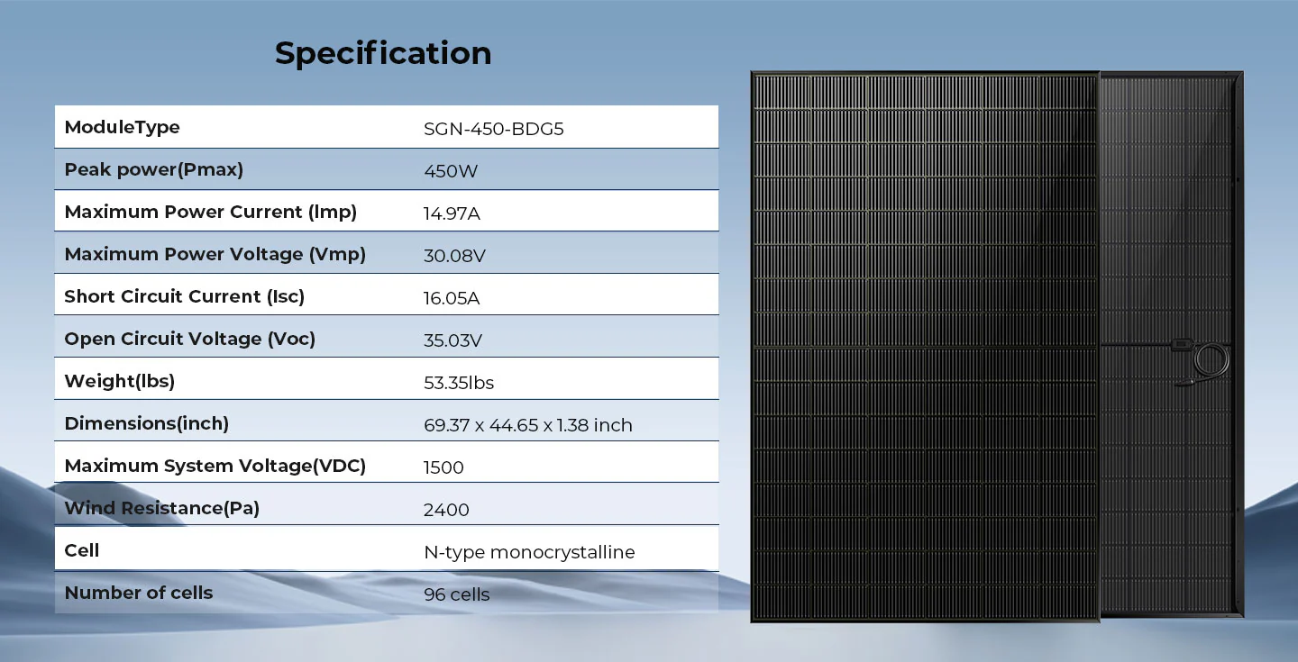 The SunGoldPower N-Type High-efficiency bifacial module solar panels can capture sunlight on both their front and back sides, generating up to 30% more energy than conventional solar panels. N-Type bifacial solar panels are ideal for installations where the backside of the solar array is exposed and can capture reflected light.