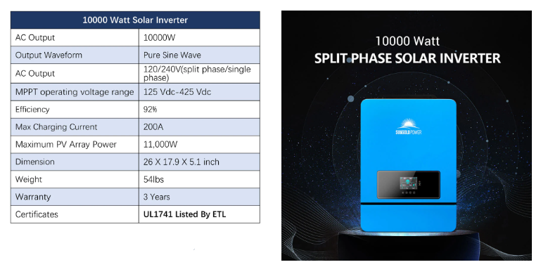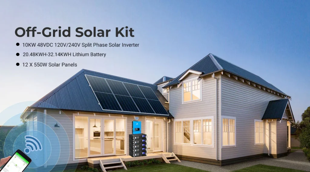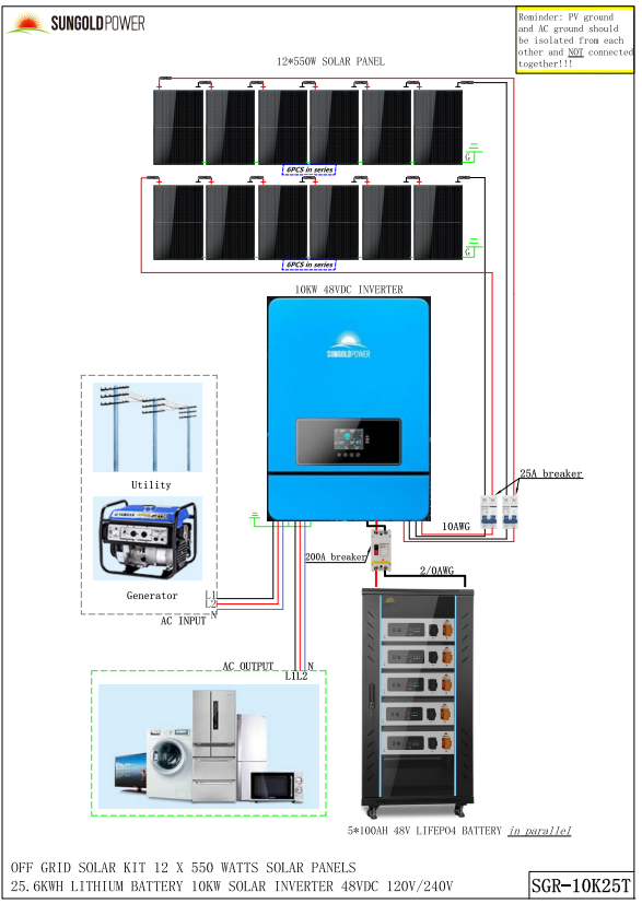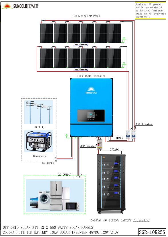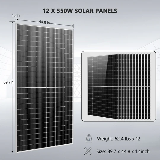 This solar package includes (12) 550W solar panels, 20.48kWh-32.14kWh LFP batteries, (1) 10kWh split-phase solar inverter (120/240Vac) and the necessary cables and mounting brackets. It will produce up to 25.6kWh per day with only 4 hours of sunlight. With its 10kW 120/240Vac split-phase solar inverter, this system is powerful enough to run high-demand appliances like an air conditioner, well pump, refrigerator, power tools, office equipment, and more! Easily expand to suit growing power needs by adding more solar panels, batteries and up to 6 identical inverters connected in single-phase (120Vac), split-phase (240Vac) or three-phase (208Vac) arrangements.