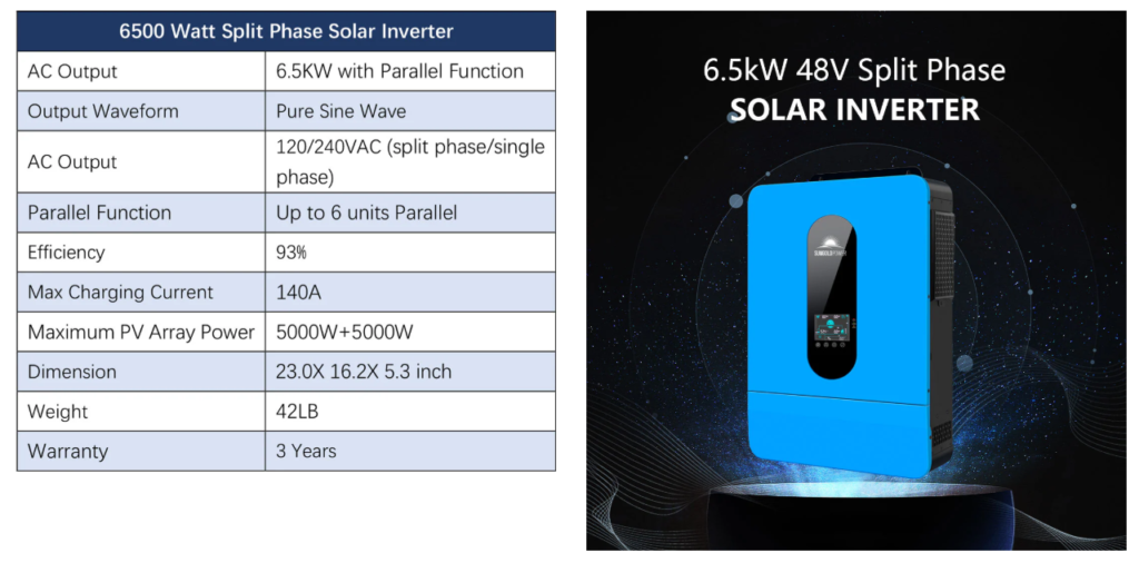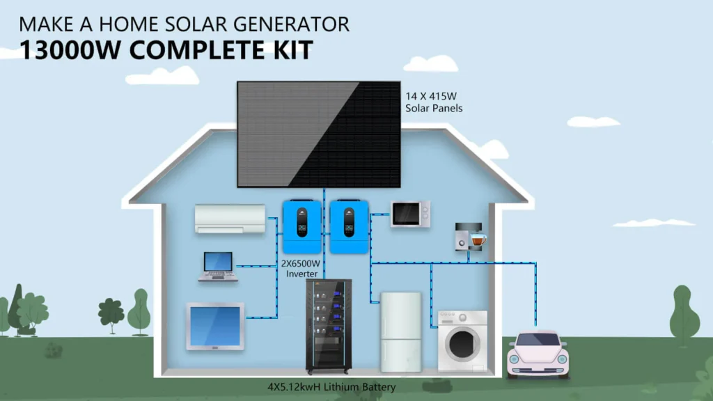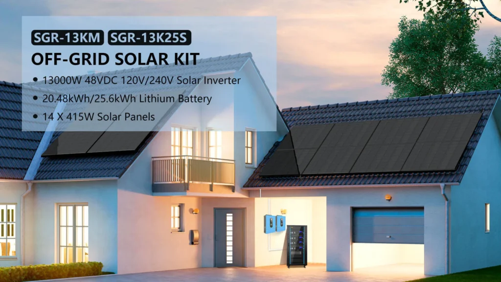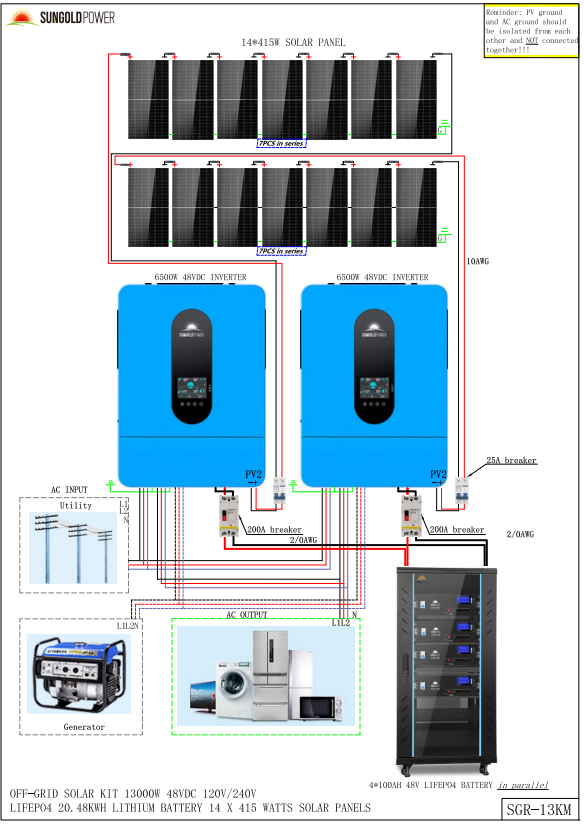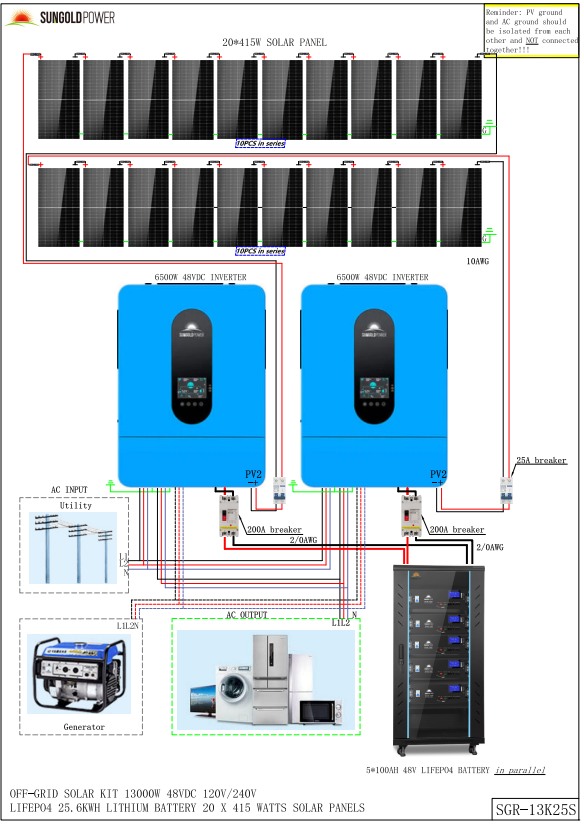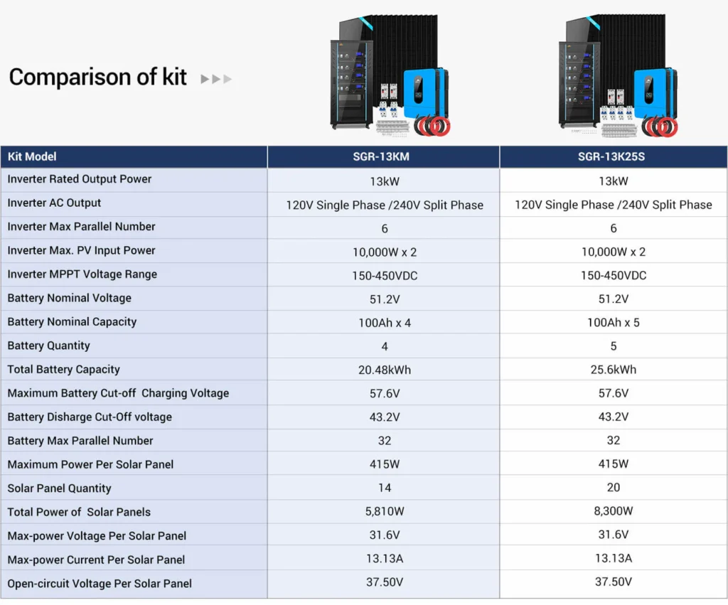 This solar panel kit is a great package for a complete off-grid home system, including (14-20) 415W solar panels, (4) 5.12KWH server rack batteries, (2) 6.5kW split-phase solar inverters, and two set of solar cables. This 13kW output system is powerful enough to run air conditioners, well pumps, fridges, TVs, a workshop, office, and more! The system is ready for expansion, as up to 6 identical inverters can be paralleled in single-phase (120Vac) or split-phase (240Vac) or three-phase (208Vac) . You can add more batteries and solar panel according to your needs. Enjoy off-grid living and the adventure with this Solar Energy Kit!