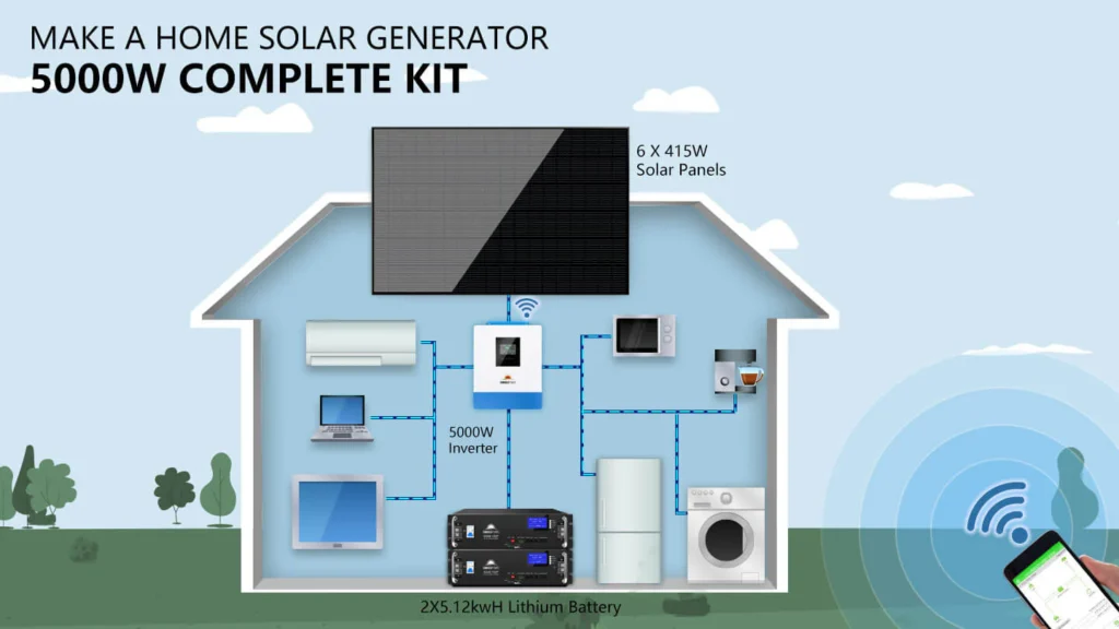 This solar kit comes with nearly everything needed to set up an off-grid solar system including a 5kW inverter, (6) 415W solar panels, (2) 5.12 kWh server rack batteries, a set of solar cables, and mounting brackets. The Solar Array will produce around 10 kWh per day based on 4 hours of sun. You can add more batteries and solar panel according to your requirements. The Wi-Fi monitor shows the performance and energy data of your solar system through an app. Enjoy off-grid living and the adventure with this Solar Energy Kit!