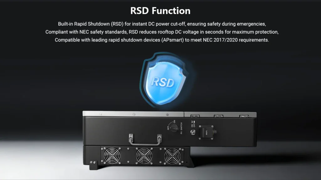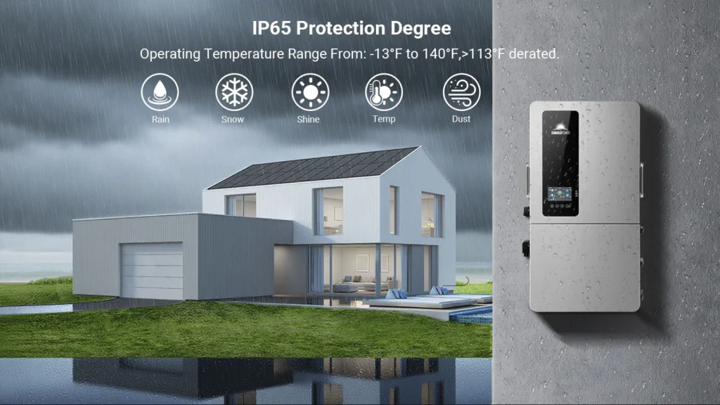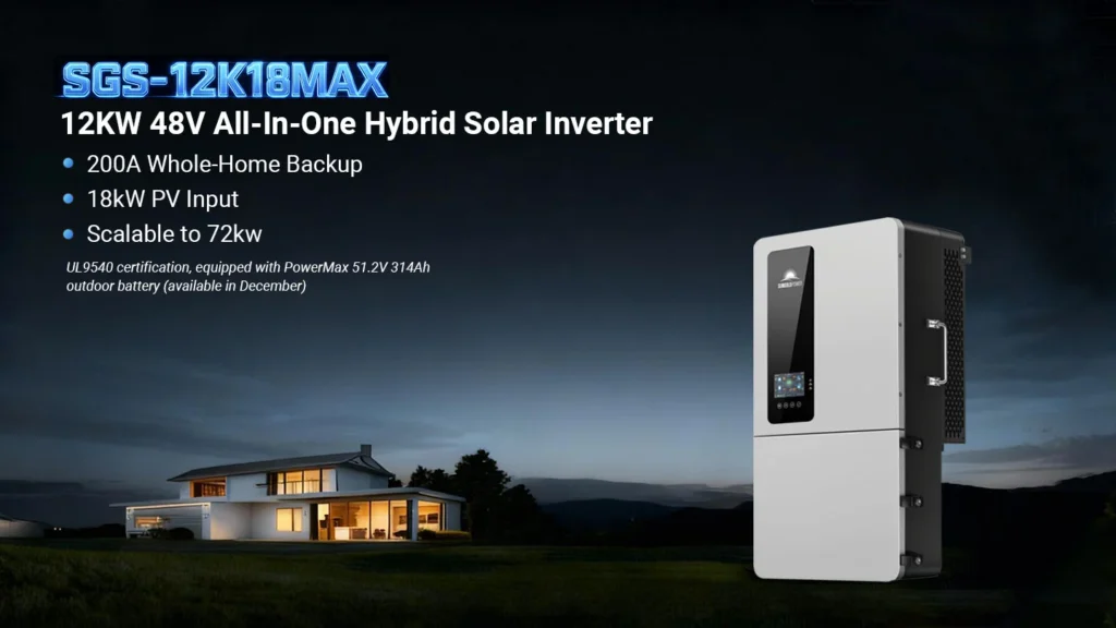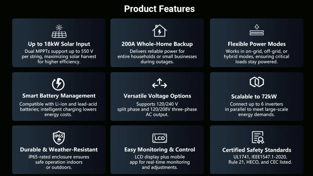 Supporting up to 18 kW PV input and scalable to 72 kW with nine (6) units in parallel, this inverter is built for homes, farms, and small businesses with high energy demands. It delivers both split-phase 120/240 V and three-phase 120/208 V, adapting easily to diverse electrical environments.