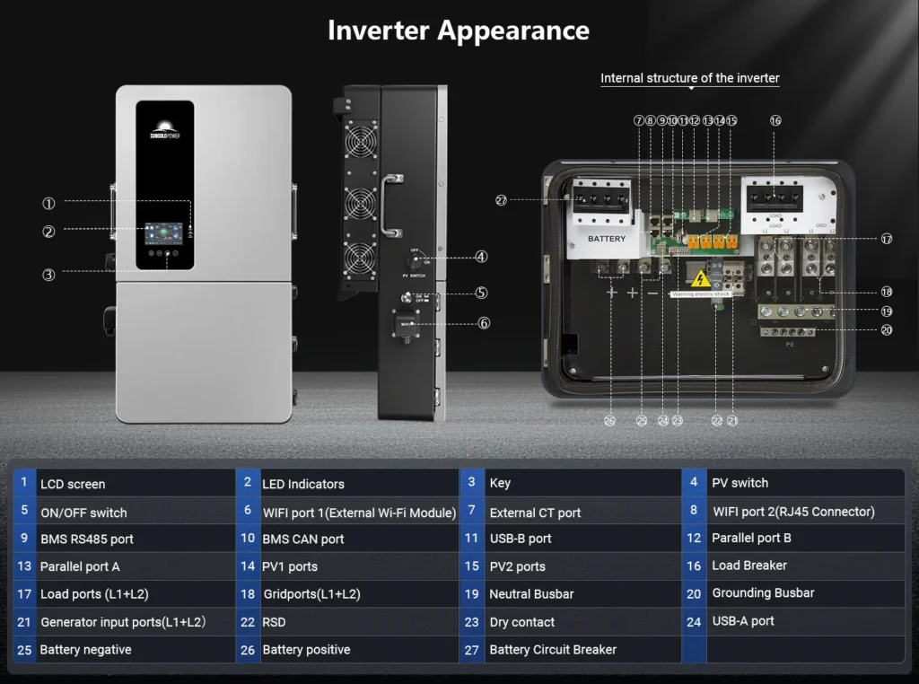 Compatible with SunGoldPower 48 V lithium batteries and other storage systems, it operates flexibly in on-grid, off-grid, or hybrid modes, even feeding excess solar power back to the grid. Designed for efficiency, reliability, and scalability, it is the perfect solution for achieving true energy independence.