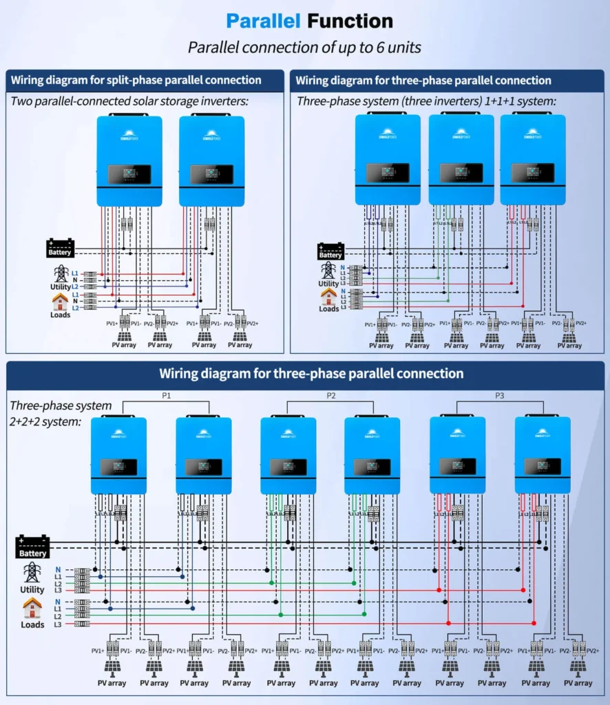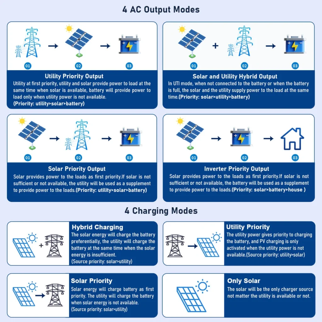 PV can charge the battery and the inverter can supply power to the load; however, if the battery has insufficient power, the grid or generator can power the load and charge the battery.