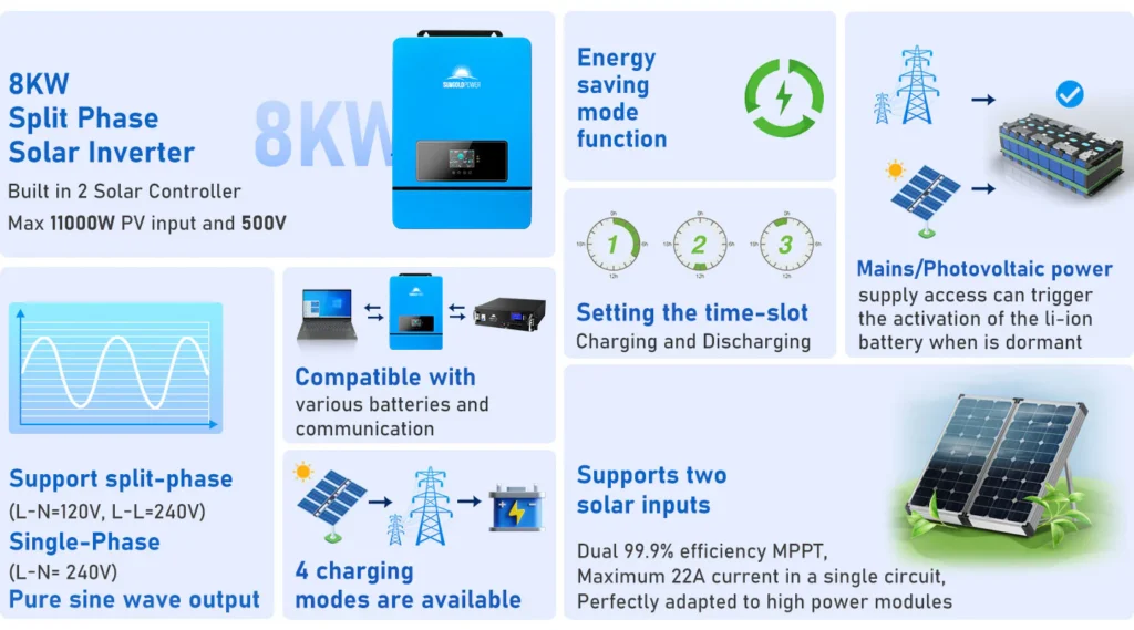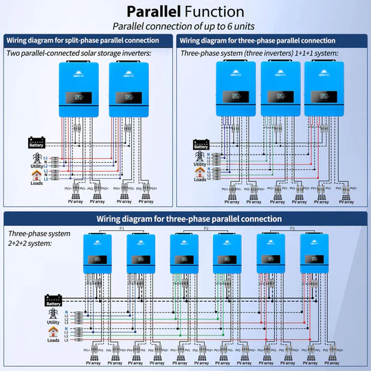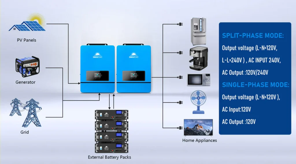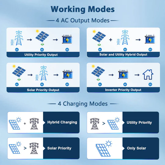 PV can charge the battery and the inverter can supply power to the load; however, if the battery has insufficient power, the grid or generator can power the load and charge the battery.