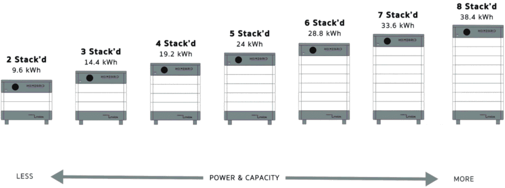 | Stack Qty | 2 (9.6 kWh), 3 (14.4 kWh), 4 (19.2 kWh), 5 (24 kWh), 6 (28.8 kWh), 7 (33.6 kWh), 8 (38.4 kWh) |